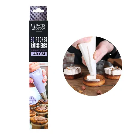 Poches à douilles jetables transparentes vendues en rouleau de 20 pièces. Ces poches pâtissières en polyéthylène sont compatibles avec toutes les douilles et sont idéales pour la décoration ou le remplissage de pâtisseries, desserts, verrines.
