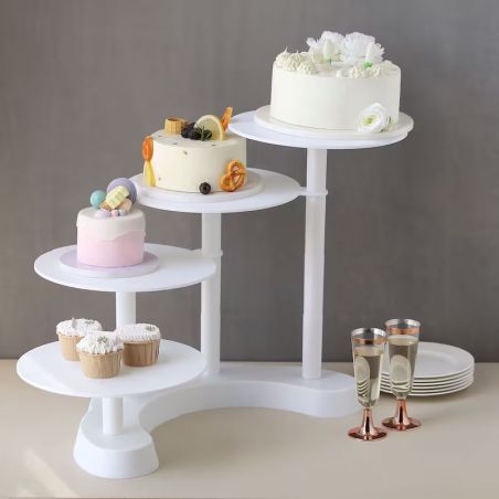Présentoir à gâteaux croissant à 4 étages, en plastique blanc, pour la présentation des gâteaux lors de mariages, baptêmes, communions...