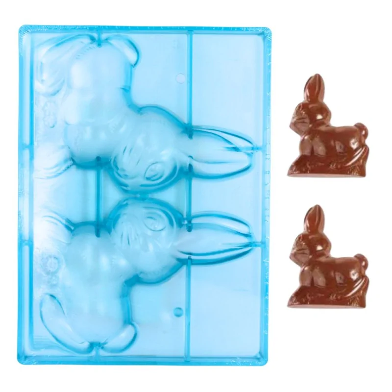 Moule à chocolat muni de 2 empreintes, permettant de réaliser un lapin assis en 3D (taille 18 cm x 20,5 cm).