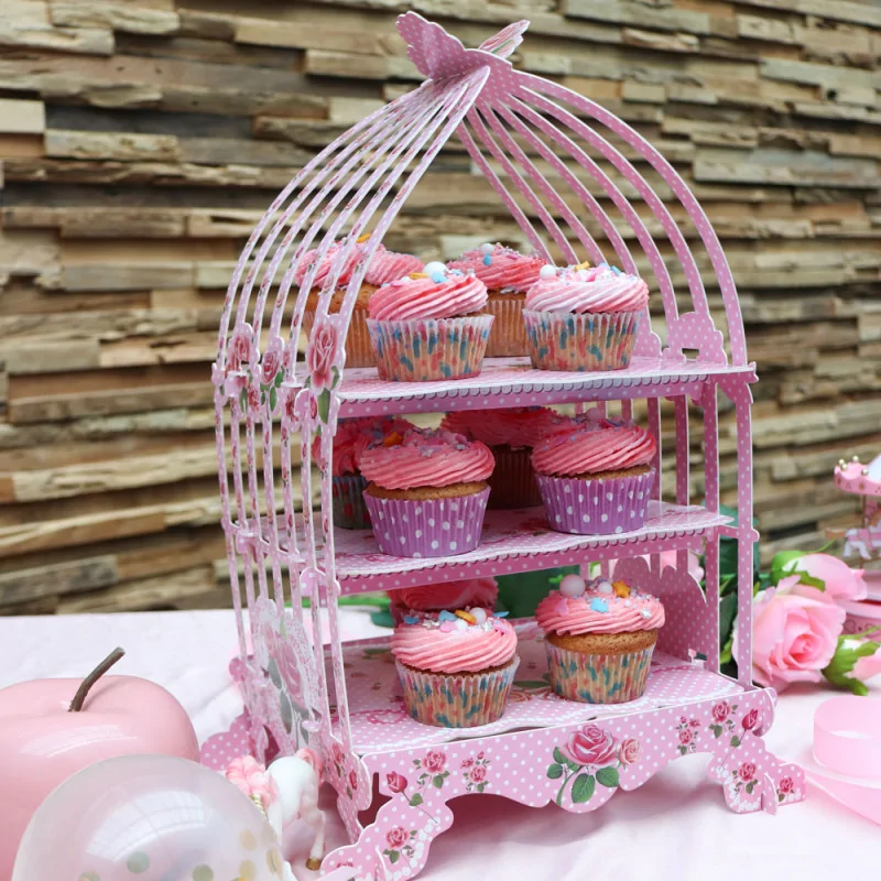 Le présentoir à étages cage à oiseaux rose en carton, délicatement orné de roses et de perles, peut présenter jusque 24 mini cupcakes. Il est parfait pour les occasions spéciales telles anniversaires, baptèmes et mariages
