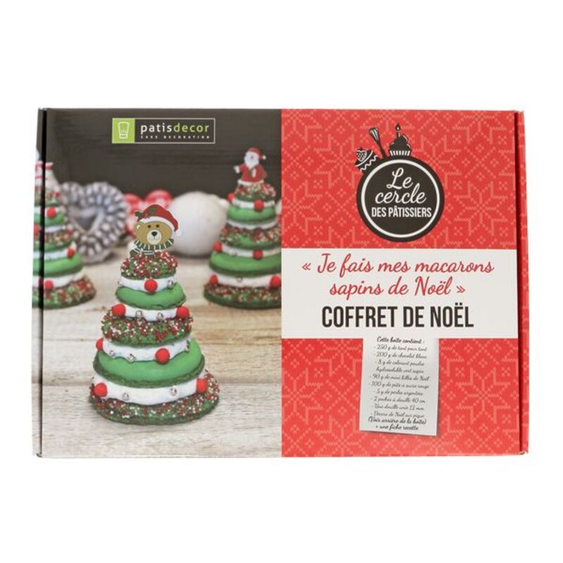 Référence : COFMACNOCoffret de Noël complet contenant tout le nécessaire pour confectionner des macarons en forme de sapins de Noël : tant pour tant, chocolat blanc, poches et douille, colorant, pâte à sucre et décors.