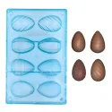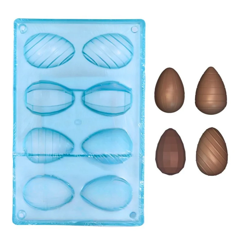 Moule à chocolat muni de 8 empreintes, permettant de réaliser quatre œufs en 3D aux motifs assortis (lignes horizontales, lignes diagonales et boules à facette).