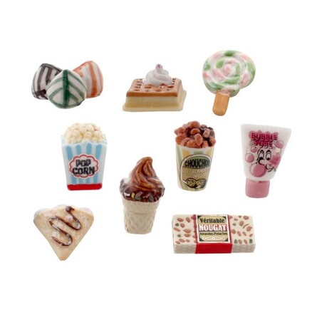 Fèves Animaux en bois (x100)Lot de 100 fèves sur le thème de la sucrerie représentant des bonbons connus de tous. 10 confiseries sont représentées dans cette série.