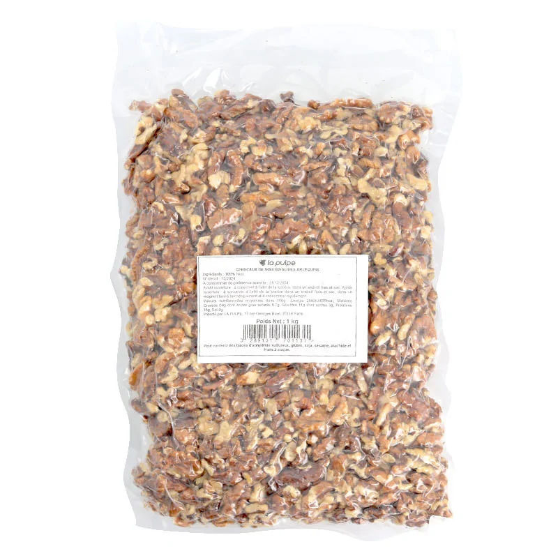 Voici des Cerneaux de noix incomplets. Nos cerneaux de noix incomplets s'utilisent parfaitement pour la pâtisserie, le chocolat, pour la confection de pains spéciaux ou encore pour accompagner des plats ainsi que les fromages à pâte persillée.