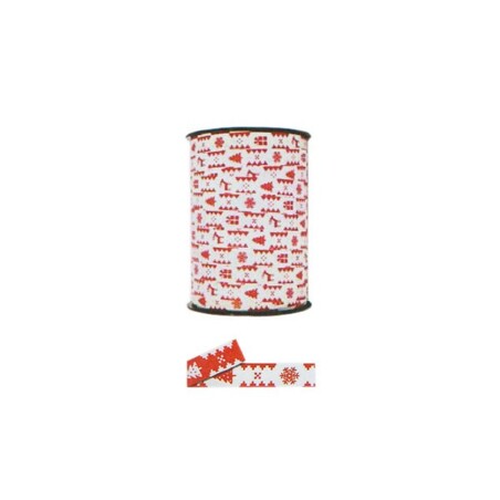 Bobine de 225 m de Ruban bolduc blanc motifs laponie, pour l'emballage et la présentation des boîtes gâteaux, des boîtes à oeufs et à poules en chocolat, des ballotins et sachets confiserie.