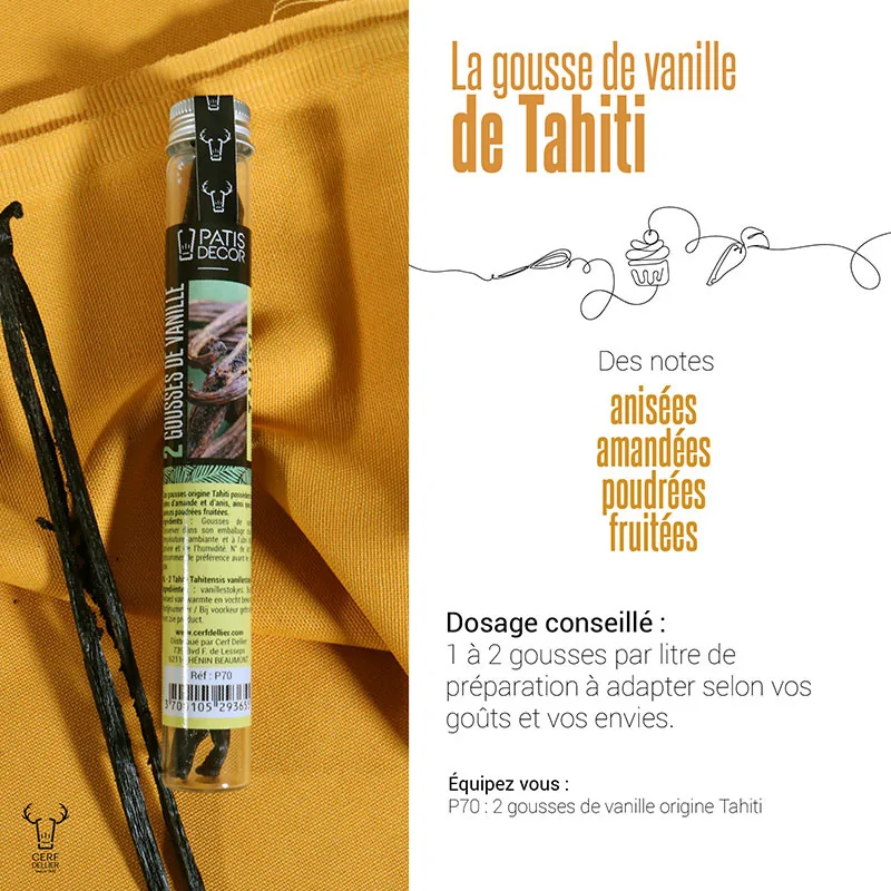 Les gousses de vanille Tahitensis sont des gousses noires, brillantes et charnues pouvant être utilisées pour les crèmes pâtissières, crèmes glacées, crèmes anglaises, bavaroises, pâtes cuites