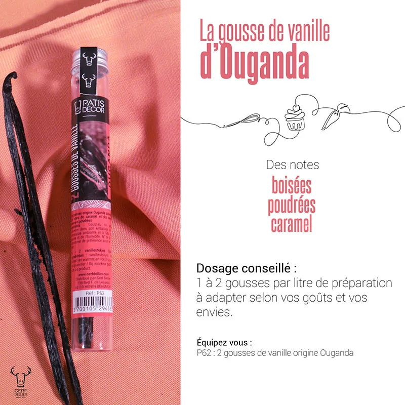 Les gousses de vanille de Ouganda sont des gousses noires, souples, brillantes et charnues, possédant des notes de caramel, boisées et poudrées. A utiliser pour les crèmes pâtissières, crèmes glacées, crèmes anglaises, bavaroises, pâtes cuites...
