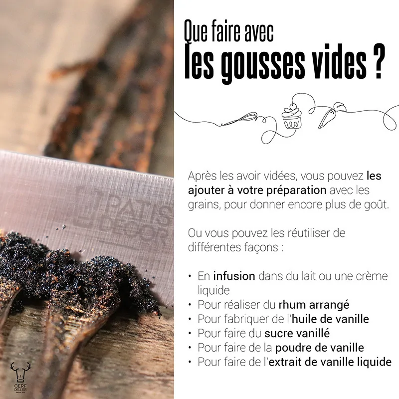Après les avoir vidées, vous pouvez ajouter les gousses de vanille à votre préparation avec les grains, pour donner encore plus de goût.