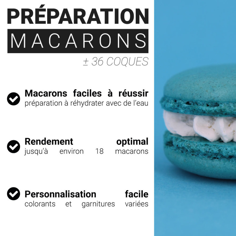 Référence : P2009Préparation à réhydrater pour coques de macarons. Idéale pour réussir facilement des macarons maison lisses, ronds et réguliers.