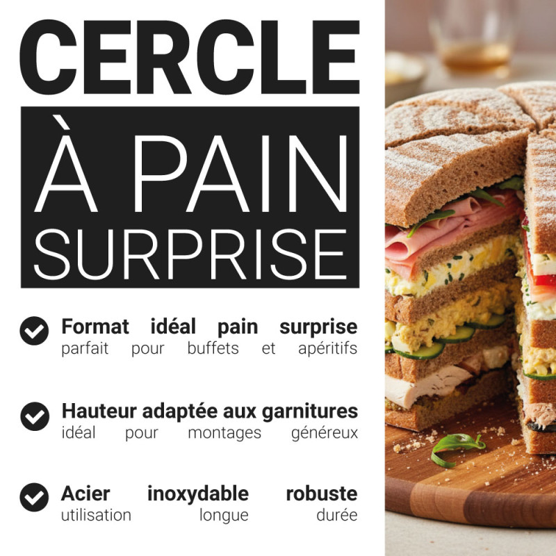 Star des repas de fête et des banquets, le pain surprise plaît à tous les gourmands. Grâce à ce cercle à pain surprise Patisdécor hauteur 9 cm Ø 24 cm, confectionner des pains surprises salés ou sucrés est facile !