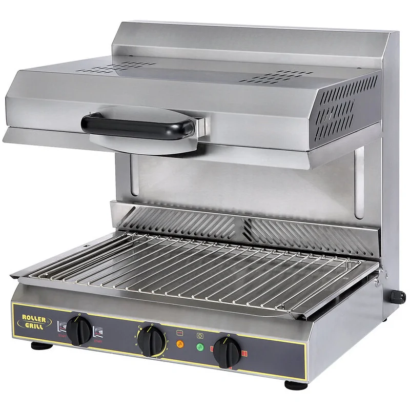 Mise en marche par détection du plat ou de l\'assiette au contact de la barre inox Arrêt instantané à l\'enlèvement du plat Chauffe instantanée : 570°C en 5 secondes Plafond vitrocéramique facile d\'entretien Plafond ajustable en hauteur en fonction du résultat souhaité Doseur d\'énergie pour maintien en température jusqu\'au grill 2 zones de chauffe indépendantes pour maîtriser cuissons et énergie Construction tout inox Plat inférieur avec grille amovible pour faciliter le nettoyage Possibilité de fonctionnement continu Surface de cuisson : 495 x 375 mm