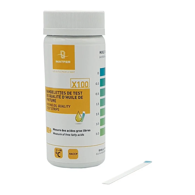 Test permettant de vérifier le vieillissement de l\'huile de friture conformément à la règlementation Facile à utiliser : bandelettes à tremper dans de l\'huile puis à comparer à l\'échelle colorimétrique A utiliser dans l\'huile froide