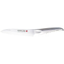 En acier inoxydable CROMOVA 18 Forme élégante : 7 points pour les 7 vertues des Samouraïs Lame en acier 3 plis avec noyau central de dureté importante pour une lame rigide, entouré de 2 couches d\'acier inoxydable plus doux Manche ergonomique pour un confort et une sécurité optimale Résiste à la corrosion Bords extérieurs de la lame et manche du même acier : ensemble encore plus solide Finition martelée pour une circulation de l\'air permettant à l\'aliment tranché de ne pas coller La longueur indiquée est celle de la lame