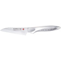 En acier inoxydable CROMOVA 18 Forme élégante : 7 points pour les 7 vertues des Samouraïs Lame en acier 3 plis avec noyau central de dureté importante pour une lame rigide, entouré de 2 couches d\'acier inoxydable plus doux Manche ergonomique pour un confort et une sécurité optimale Résiste à la corrosion Bords extérieurs de la lame et manche du même acier : ensemble encore plus solide Finition martelée pour une circulation de l\'air permettant à l\'aliment tranché de ne pas coller La longueur indiquée est celle de la lame