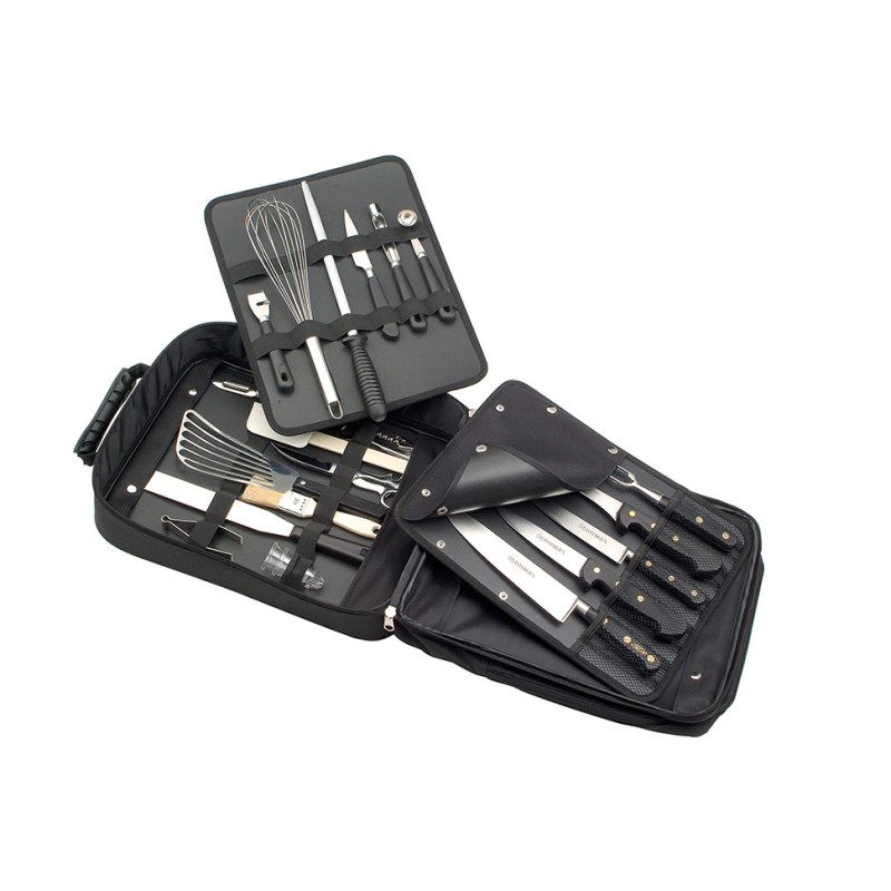 Sac à dos vide MATFER multi rangements 2 grandes poches avec deux plaques ayant un rabat Assure le transport de vos outils sans risque de vous blesser et protège les couteaux Il peut contenir jusqu'à 21 pièces Sa poche sur le devant sert à ranger votre tablette, cahiers, livres, stylos