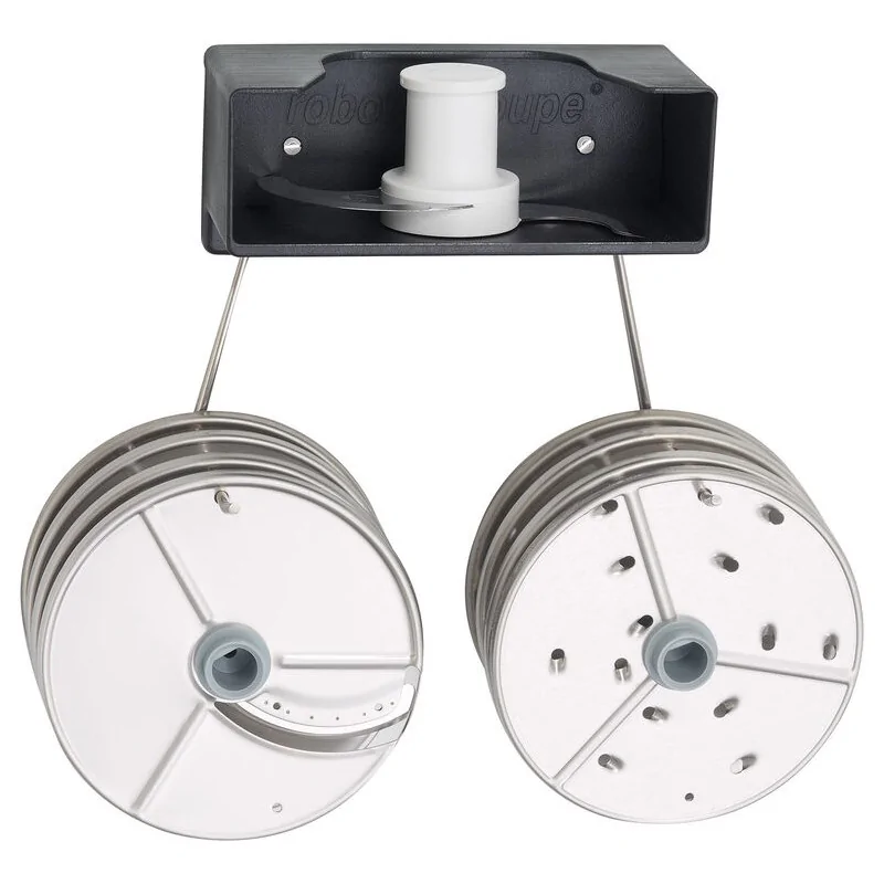 Rangement mural pour couteaux et disques Boite en PA Pratique car deux tiges en inox permettent d\'accrocher plusieurs disques, tels que le disque à brunoise, à gaufrettes de légumes, l\'éminceur...