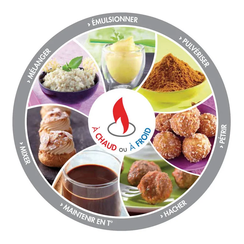 5 fonctions vitesse: vitesse variable de 100 à 3500 tours/min, haute vitesse turbo 4500 tours/min, pulse à vitesse variable, mélange des produits délicats en rotation inverse du couteau de 100 à 500 tours/min