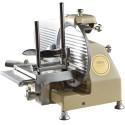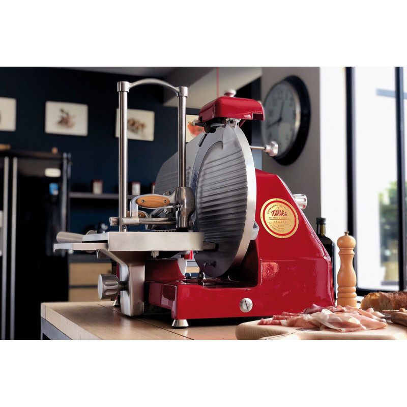 Trancheuse électrique verticale, idéale pour la coupe de charcuterie sèche Fabrication artisanale soignée, machine conçue pour une utilisation intensive Bâti en fonte peinte et vernie Chariot démontable et mécanisme en fonte polie et acier inoxydable Lame en acier chromé, épaisseur de coupe 0 à 14 mm Cordon d\'alimentation 150 cm Affûteur incorporé Capacité de coupe rectangulaire 270x210 mm Capacité de coupe circulaire Ø 200 mm Rotation 210 tours/min