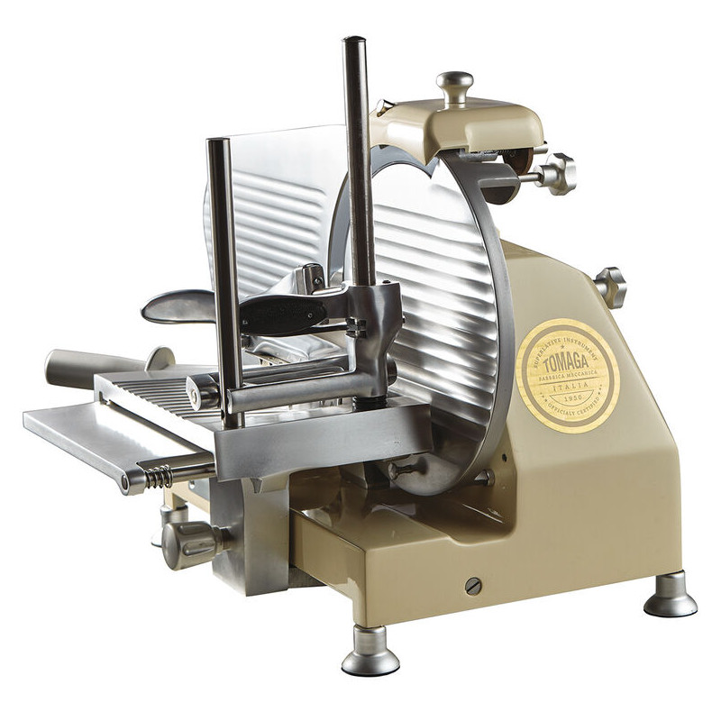 Trancheuse électrique verticale, idéale pour la coupe de charcuterie sèche Fabrication artisanale soignée, machine conçue pour une utilisation intensive Bâti en fonte peinte et vernie
