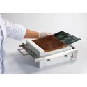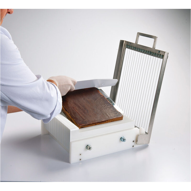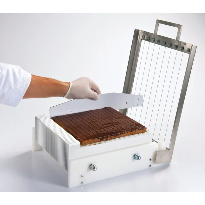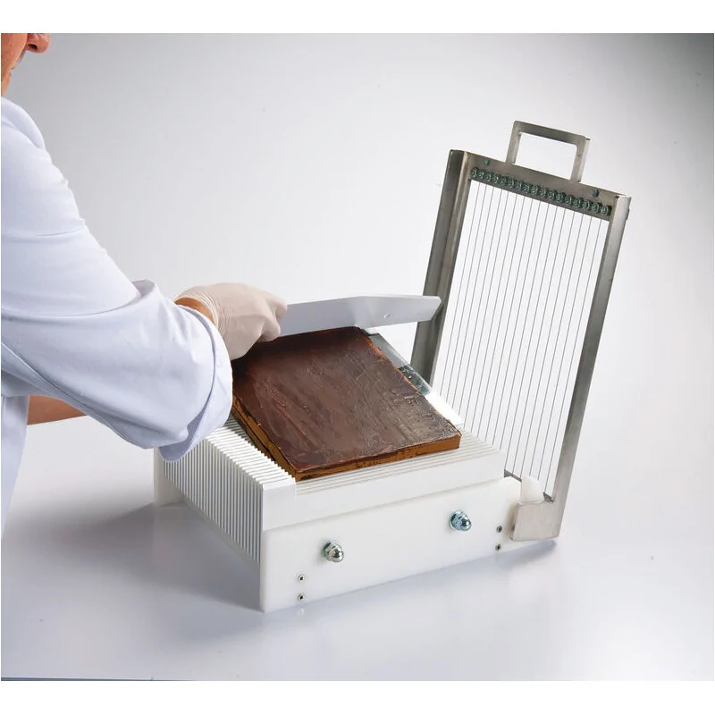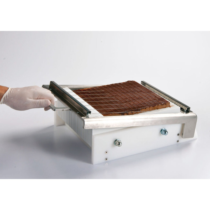 Répond aux besoins de petite production dans les restaurants, écoles professionnelles, pâtisseries Permet la découpe de bandes, carrés ou rectangles de ganaches, pâtes de fruits, entremets, etc Faible encombrement