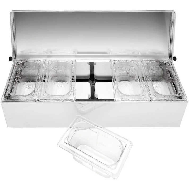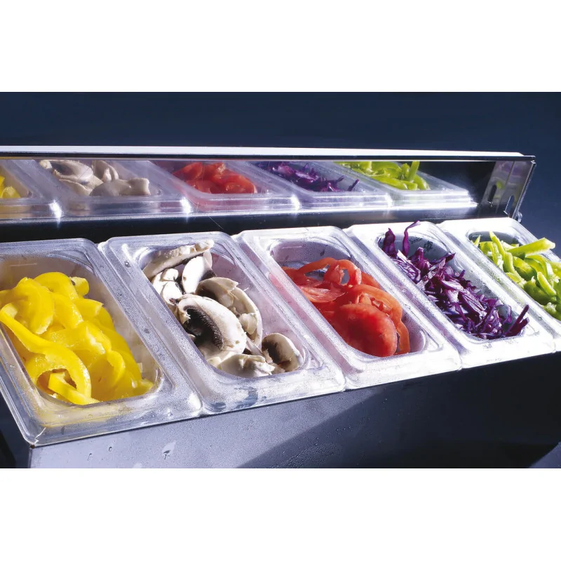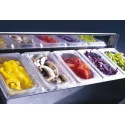Utilisation avec des plaques eutectiques congelées pour une excellente conservation au frais Fonctionne sans électricité Maintient les herbes fraîches pendant toute la durée du service Maintient au frais des ingrédients destinés à la préparation des sandwiches, des salades composées, des glaces pendant plusieurs heures Livré avec 5 bacs GN1/9 contenance 1L, P100mm et 2 plaques eutectiques Modulable selon besoins: 2 bacs GN1/9 et 1 bac GN1/3 ou 2 bacs GN1/6 et 2 bacs GN1/9 Encombrement très réduit Equipé de 5 bacs GN 1/9 en copolyester cristal+