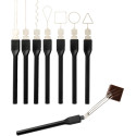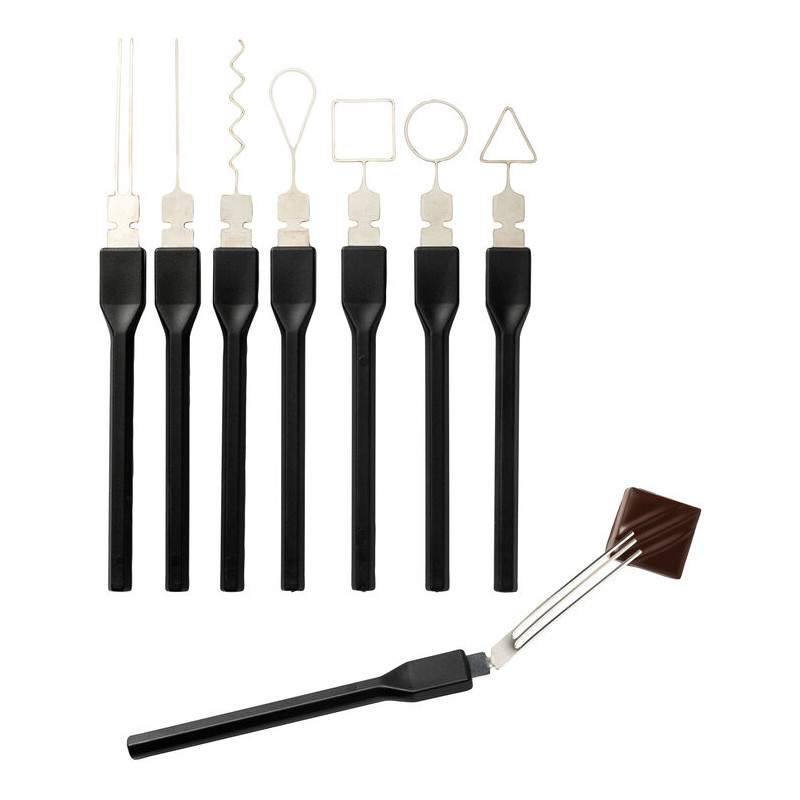 Boîte de 8 fourchettes à décor en fil d\'acier inoxydable Destinées à marquer le dessus des bonbons chocolat après enrobage 8 modèles de décor assortis : 1 dent, 2 dents, 3 dents, rond, carré, triangle, goutte, zig zag Angle de travail adaptable à la main de l\'artisan, par pliage Manche à géométrie hexagonale pour une prise en main idéale Livrées dans une boîte de rangement