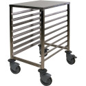 Chariot avec dessus insonorisé, pouvant servir de plan de travail ou accueillir une machine Glissières avec butées anti-glisse 4 roulettes pivotantes en composite dont 2 munies de freins Largeur entrée 400 mm