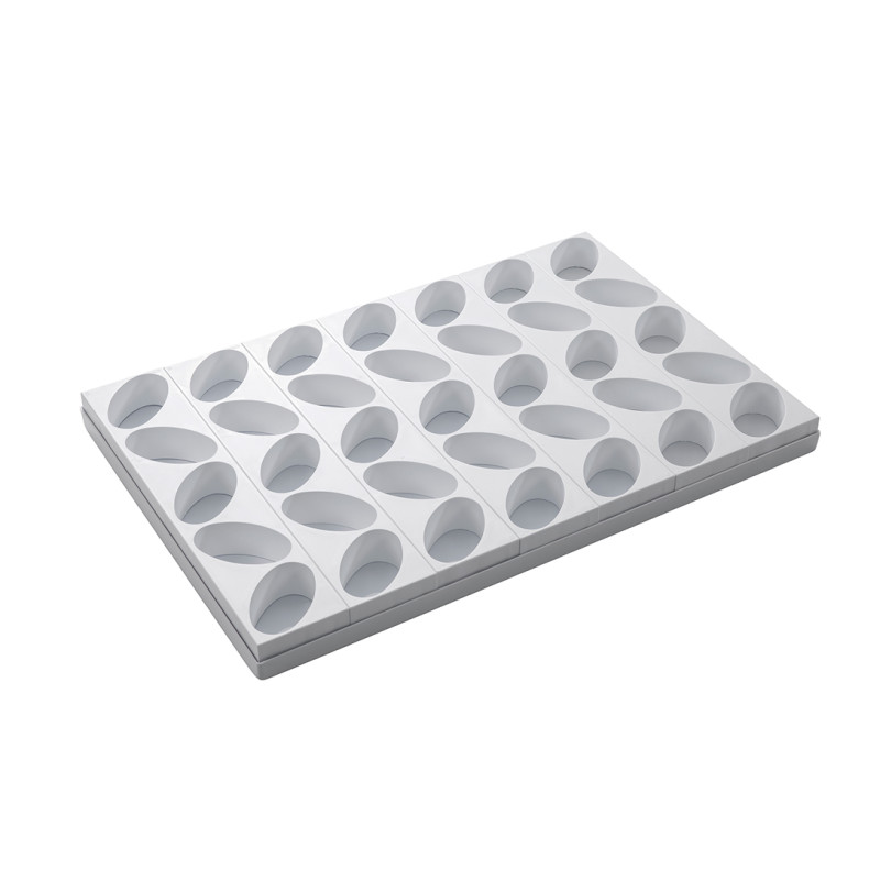 En polystyrène Compatible avec les chambres froides négatives et les congélateurs Contient une plaque de support et 7 bandes de 5 ou 4 moules identiques Permet un montage rapide de gâteaux et mini-gâteaux individuels Peut être utilisé avec un démouleur qui permet une extraction express des gâteaux Contenance de 55 à 75 g selon le modèle et la densité des produits