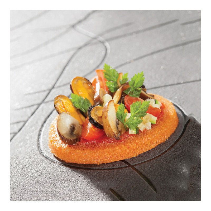 Forme en tricot de verre recouvert de plusieurs couches de silicone Avantages du système Flexipan : souplesse, maintien et anti-adhérence Démoulage facile sans graissage au préalable Compatible avec tous types de fours Cuisson et coloration homogènes 2000 à 3000 cuissons par moule suivant les références Facile à nettoyer (il suffit de le tremper dans l\'eau chaude après utilisation) Format de plaque adapté à la production en série Utilisable en cuisson comme en surgélation de -40° à +260°C