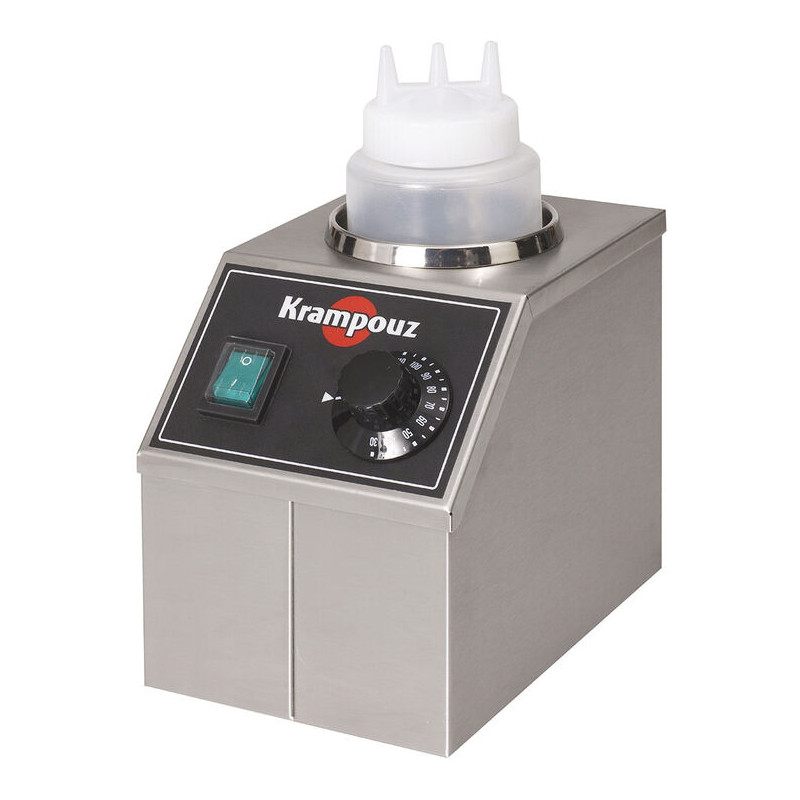 Idéal pour chauffer/maintenir à température constante préparations sucrées/salées Permet une garniture rapide et facile des crêpes, gaufres ou chocolat Idéal pour la vente à emporter par exemple Pratique car thermostat réglable de 0°C à 90°C Très résistant, rigide et possède une excellente longévité Très facile d\'entretien pour une hygiène irréprochable Livré avec 1 bouteille 1L graduée avec un bouchon 3 becs verseurs - polyéthylène (code 116341) Chassis en inox