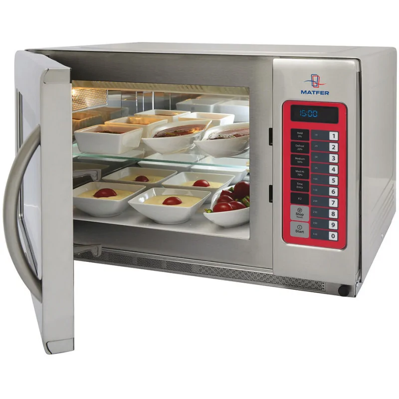 Carrosserie et cavité intérieure en acier inoxydable Adapté à une utilisation intensive en restaurant ou en collectivité Emission d\'ondes par le haut et bas pour une parfaite répartition de la chaleur et cuisson homogène Capacité totale de 100 programmes possibles Possède un minuteur allant jusqu\'à 60 minutes Filtre à air amovible pour un entretien parfait Excellente durée de vie Facile d\'entretien et de nettoyage Format intérieur GN2/3 avec étagère intermédiaire et sole fixe 5 niveaux d\'énergie Dimensions intérieures : 360x400x228 mm Equipé de 2 magnétrons Toshiba, puissance restituée 2100/3200W