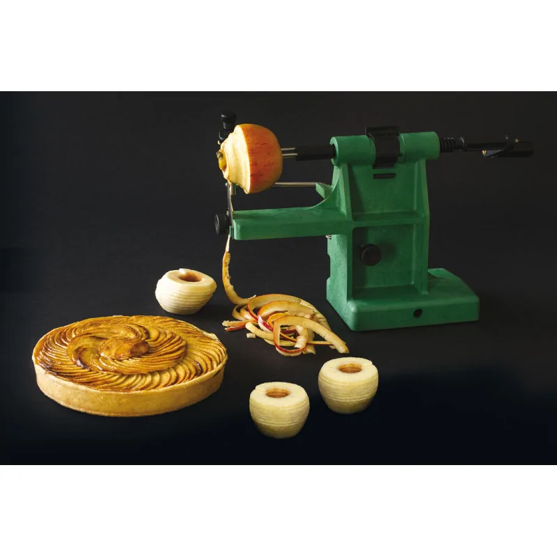Pèle-pomme réalisé en matériau composite inaltérable Couteaux en acier inoxydable de type coutellerie pour un excellent tranchant Possibilité d\'adapter l\'épaisseur d\'épluchage, le diamètre des trognons et la pression du peleur