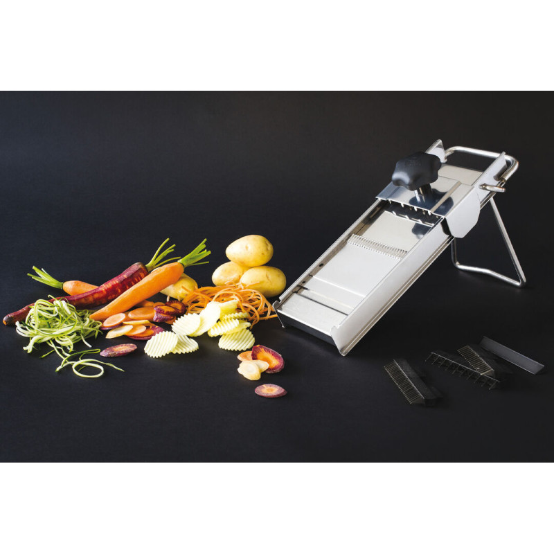 Mandoline en acier inoxydable Lame réversible et gaufrée en acier Réglage précis et fin de l\'épaisseur de tranchage jusqu\'à 10 mm pour une découpe en bâtonnets, précise et nette Livrée avec un jeu de 3 effileurs 3,5 et 10 mm Poussoir inox en option Facile d\'entretien : corps démontable sans outils, passe au lave-vaisselle