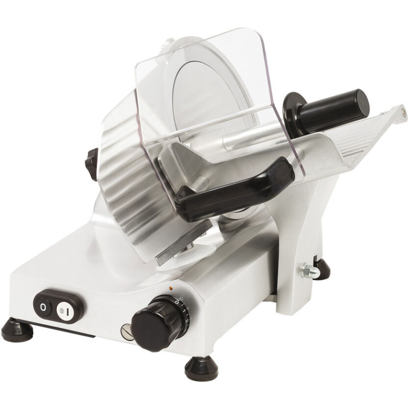 Robuste : Bâti et chariot en alliage d\'aluminium anodisé, couteau en acier inoxydable Lame en acier inoxydable Epaisseur de coupe à réglage précis de 0 à 16 mm Transmission par courroie, silencieuse et évitant les échauffements Non lavable au jet Chariot non démontable Diamètre de lame 195 mm Capacité de coupe l 160mm x H 140mm Sans affûteur