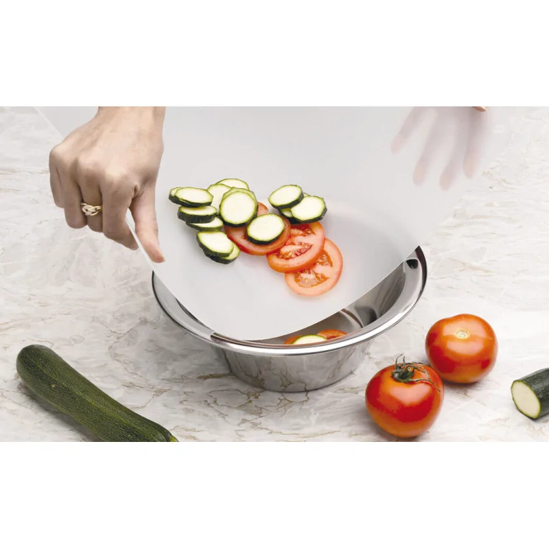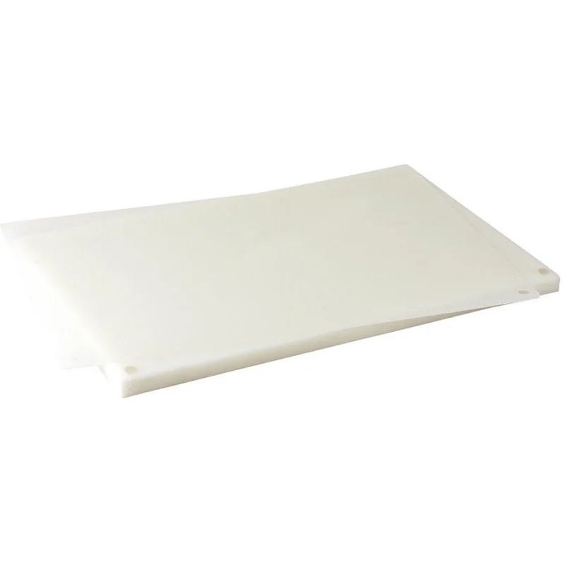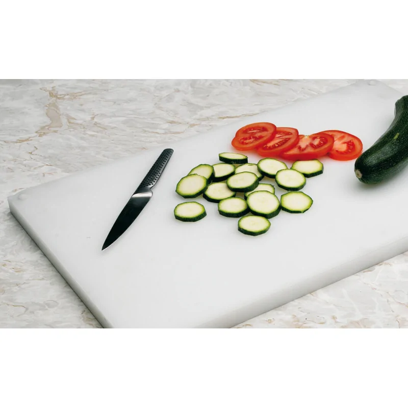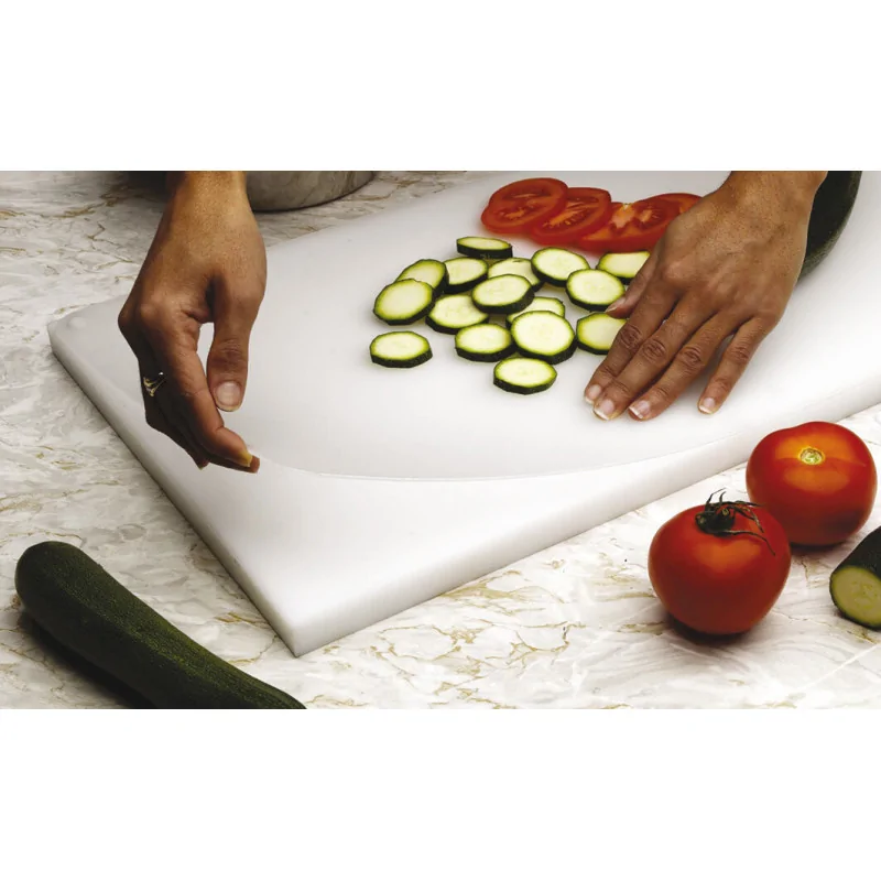 Pratique, hygiénique et compatible HACCP Système moins couteux que le changement intégral de la planche à découper ou son rabotage Plaques de découpe remplaçables et réversibles Conserve le plan de découpe plat, non soumis à l\'usure Plaque parfaitement calée sur la planche grâce aux ergots Plaque dissociable et flexible permettant de transvaser les aliments coupés dans un récipient Set comprenant un planche support rigide en PEHD épaisseur 20mm équipée d\'ergots et une plaque flexible en polyéthylène épaisseur 1,5mm