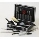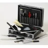 En nylon de qualité supérieure, très résistant à l\'usure Compartiment amovible, disposant de 6 rangements pour couteaux Compartiment fixe de 12 rangements pour les petits accessoires Idéal pour les apprentis et les professionnels exigeants car elle répond bien aux besoins Livrée avec 2 séparations pour moduler la base de l\'espace principal Grande modularité grâce aux velcro et bandes de séparation modulables Lavable en machine à 30°C Malette cuisine 24 pièces Comprenant : 1 fusil 25 cm (réf 125055),1 aiguille inox 20 cm (réf 120841),1 couteau éminceur 25 cm (réf 120415),1 couteau filet de sole 17 cm (réf 120423),1 couteau d\'office 10 cm (réf 120406),1 fourchette (réf 112070),1 spatule inox 25 cm (réf 112652),1 cuillère à pomme (réf 121006),1 éplucheur (réf 120901),1 pince du chef (réf 652013),1 vide pomme (réf 090440),1 spatule Exoglass® 30 cm (réf 113030),1 canneleur (réf 120910),1 fouet inox 25 cm (réf 111022),1 pinceau 3,5 cm (réf 116013),1 spatule Elvéo 25 cm (réf 113724),1 désosseur 13 cm (réf 120408),1 paire de ciseaux inox 22 cm (réf 120801),1 poche 30 cm (réf 161003),1 douille unie (réf 167104),1 douille cannelée (réf 167033),1 râcle tout (réf 112840),1 thermomètre sonde (réf 250502),1 mallette vide