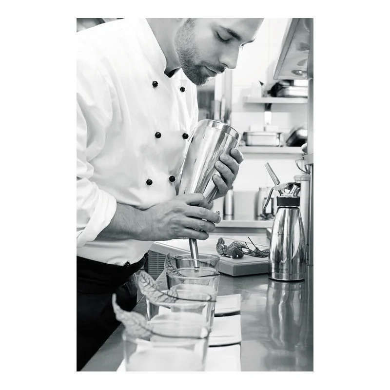 Siphon professionnel pour préparations froides Corps en acier inoxydable brossé, tête en acier inoxydable avec valve fixée Siphon tout inox, sécurité d\'utilisation , conforme à la norme DF21-901:2013
