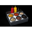 En acier inoxydable Couvercle en plexiglass: protection des ingrédients Idéal pour la mise à disposition de toutes vos épices de façon simple et soignée Support incliné pour une plus grande praticité et une meilleure visibilité Très résistant, rigide et possède une excellente longévité Bols ABS 55cl: diamètre 100mm, H90mm 1 compartiment arrière pouvant recevoir 4 bouteilles verseuses Très facile d\'entretien pour une hygiène irréprochable