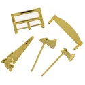 Ensemble de 5 décors en plastique dorés, idéal pour décorer élégamment vos bûches, desserts et cupcakes de Noël. Décors assortis dorés : haches et scies.