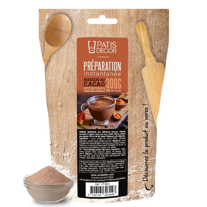 Ingrédients : Sucre, poudre de cacao (33 %), cannelle, gingembre, piment rouge, amidon de maïs.