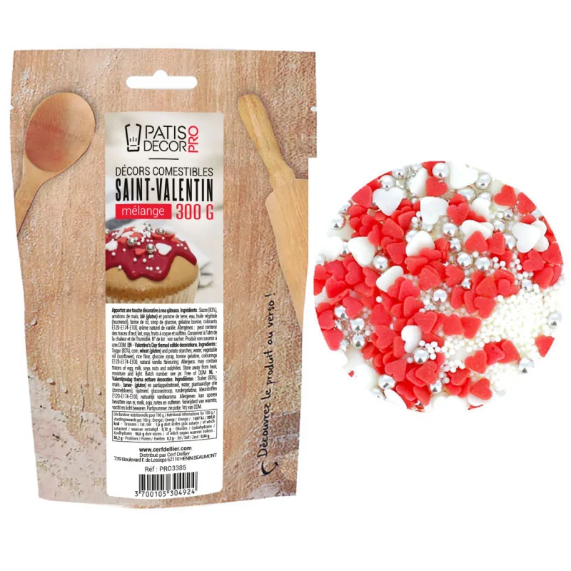 Ce sachet de 300g de décors comestibles Saint Valentin assortis se compose de : petits cœurs assortis rouges et blancs, perles comestibles argentées, mini billes comestibles blanches.