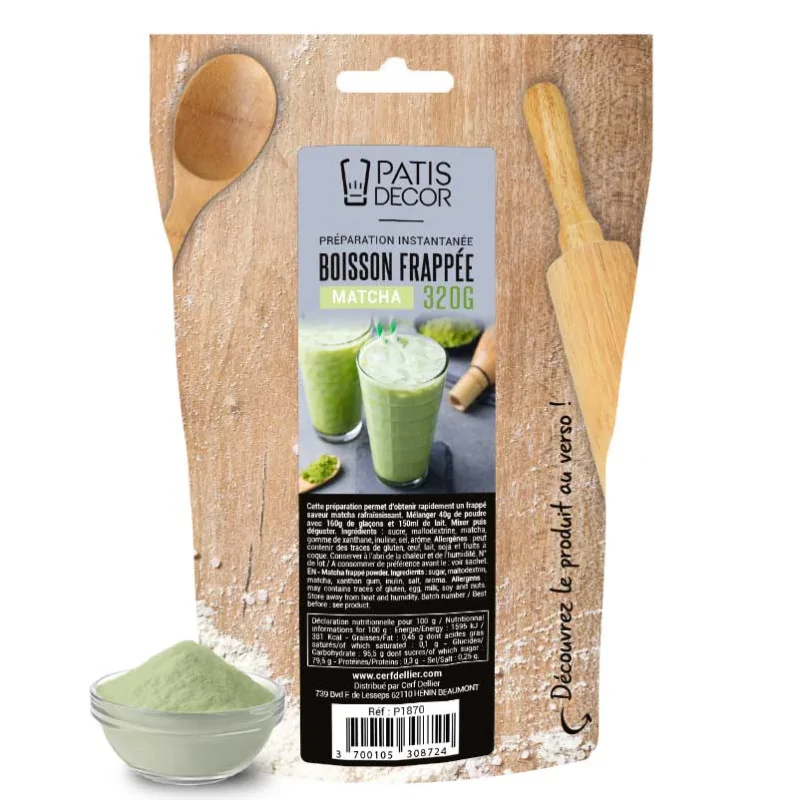 Cette préparation instantanée pour boisson Patisdécor vous permet de concocter une multitude de matcha frappés. Le terme "frappé", d'origine française, décrit le processus de préparation de cette boisson : pour obtenir sa texture glacée et onctueuse, il suffit de mixer les ingrédients avec des glaçons, les refroidissant ainsi et harmonisant le mélange.
