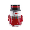 Originale et ludique, cette boîte à biscuits culbuto en métal rouge, blanc et vert représente un souriant bonhomme de neige.