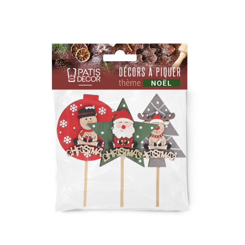 Ensemble de décors sur pic en bois, représentant un bonhomme de neige, un renne et un père Noël.