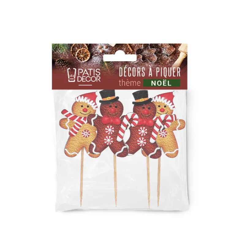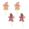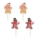 Ensemble de décors sur pic en bois, représentant quatre bonhommes en pain d'épice.