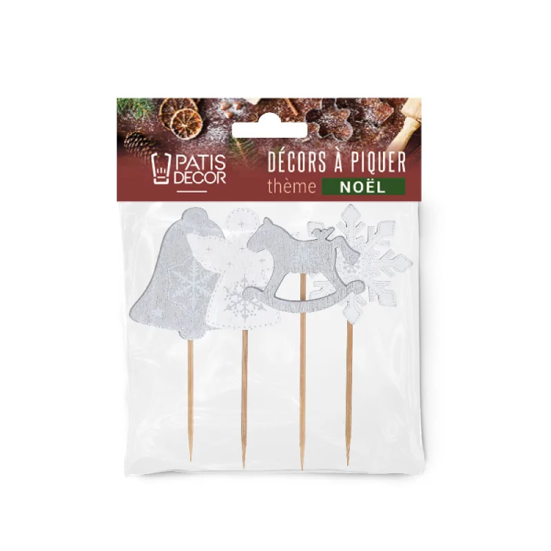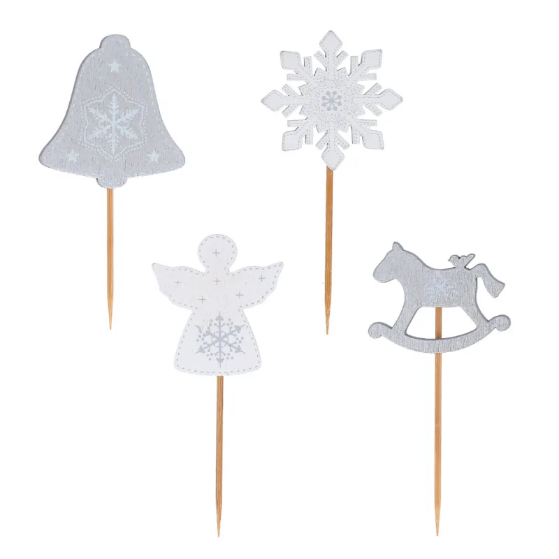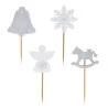 Ensemble de décors sur pic en bois, représentant une cloche, un ange, un flocon et un cheval à bascule gris et blanc.