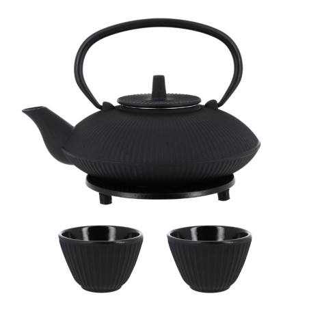 Coffret théière + tasses à rayures en fonte noir - 800 ml