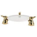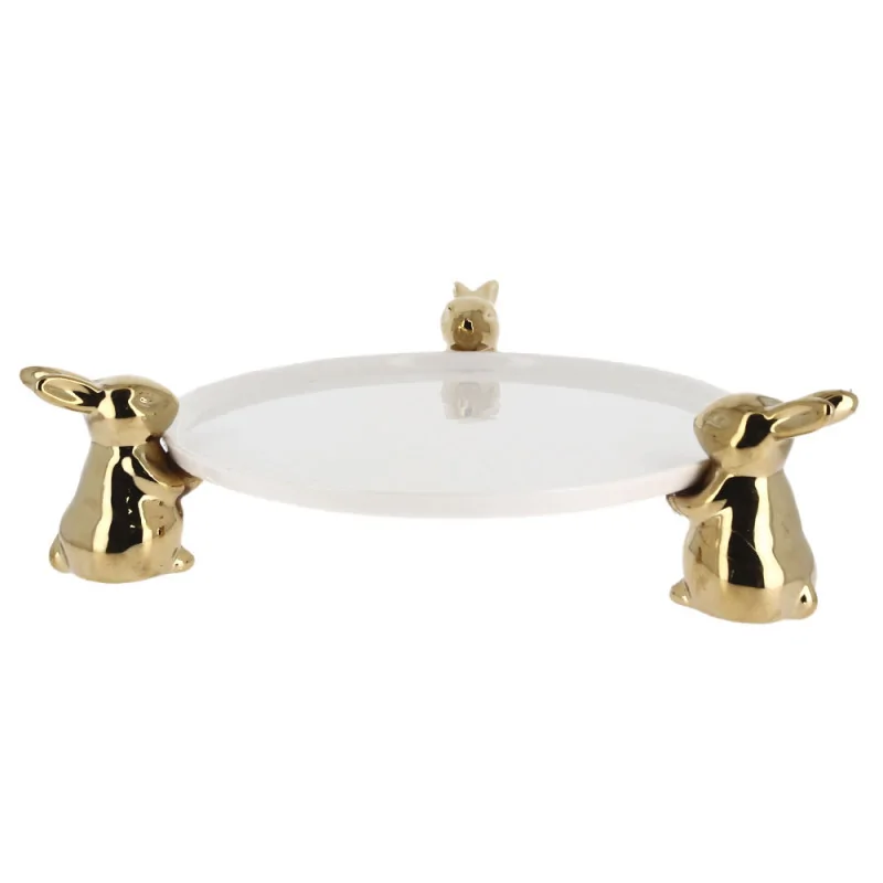 Présentoir rond de 30 cm de diamètre en céramique avec trois pieds en formes de lapins dorés.