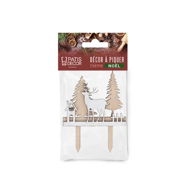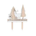 Décors 2D en bois avec pic, motif d'un renne à côté d'une maison et deux sapins en arrière-plan