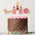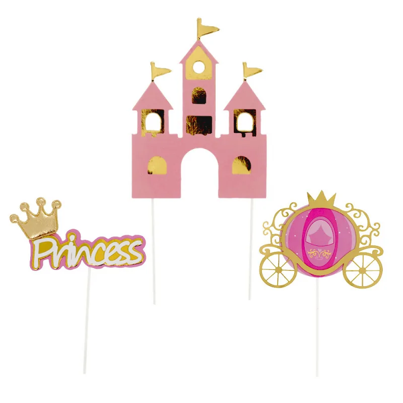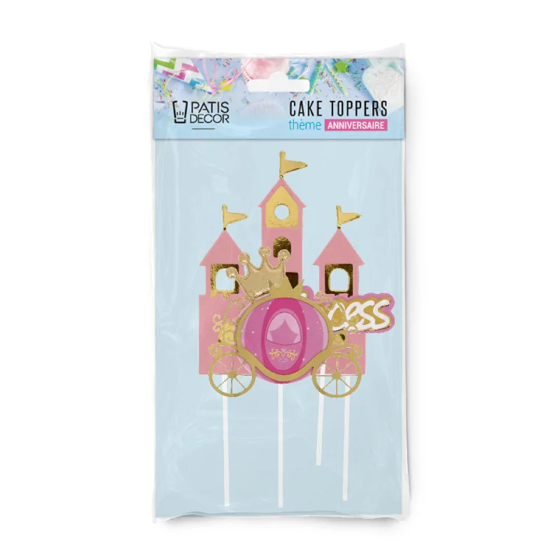Lot de 3 cakes toppers anniversaire sur le thème princesses, le lot contient les motifs suivants : un carrosse, un château et un motif "Princess".